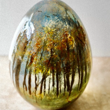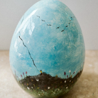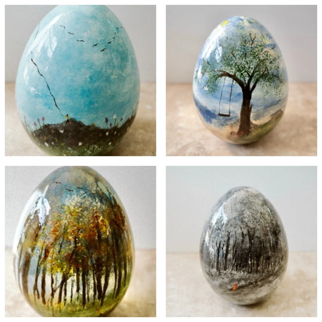 This collection of four hand-painted 9" ceramic eggs, titled "The Four Seasons," beautifully interprets the annual cycle of nature. The first egg, representing Spring, features a tranquil scene of a lone figure standing on a grassy hill with wildflowers, looking up at birds flying across a vibrant, light blue sky, which captures the feeling of new life and open air. The Summer egg is centered on a large tree with lush green leaves and a swing hanging from one of its branches, all set against a soft blue sky, symbolizing the long, peaceful days of the season. The Autumn egg is a richly textured and impressionistic representation of a forest in a warm palette of deep greens, rusty browns, and yellows, suggesting the changing leaves of the season. The final egg, for Winter, is the most somber, with a monochromatic and moody depiction of a bare forest in stark shades of black and white, capturing the quiet, cold beauty and stillness of the season.