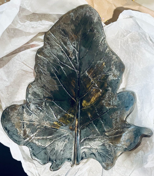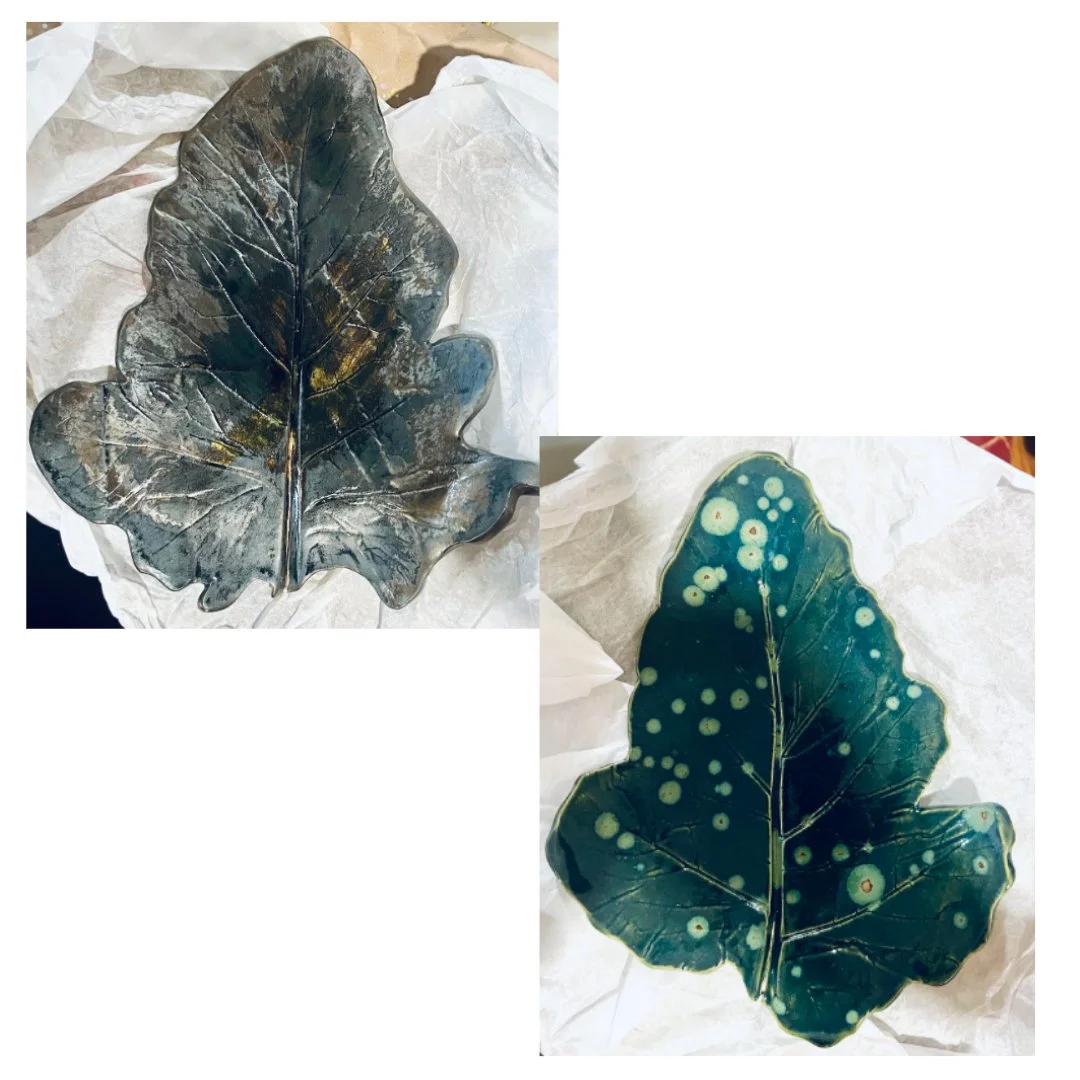 This collection of two unique, handcrafted ceramic pieces is a tribute to the beauty of the natural world. Each tray is skillfully shaped with the organic elegance of a large leaf, featuring detailed veining that brings a sense of life and authenticity to its design. Perfect for use as decorative clutter, unique serving dishes, or sculptural art pieces, they make a stunning addition to any home, celebrating the artistry found in nature. The first tray, The Gunmetal Botanica, showcases a sophisticated, metallic glaze that gives it a rich, antiqued appearance. Its surface is a captivating blend of deep charcoal and gunmetal gray, accented with subtle, shimmering touches of gold that catch the light. This high-gloss finish highlights the intricate texture of the leaf, creating a dramatic and elegant statement piece that adds a touch of modern luxury to any space. The second tray, The Dewdrop Platter, is a vibrant and whimsical counterpart. Finished in a lively, glossy teal-green glaze, its surface is dotted with lighter blue and brown spots. This artistic pattern creates a playful, organic look reminiscent of dewdrops on a leaf in the morning light. The bright colors and cheerful design of this piece make it a perfect accent for adding a pop of natural charm and personality to your home.